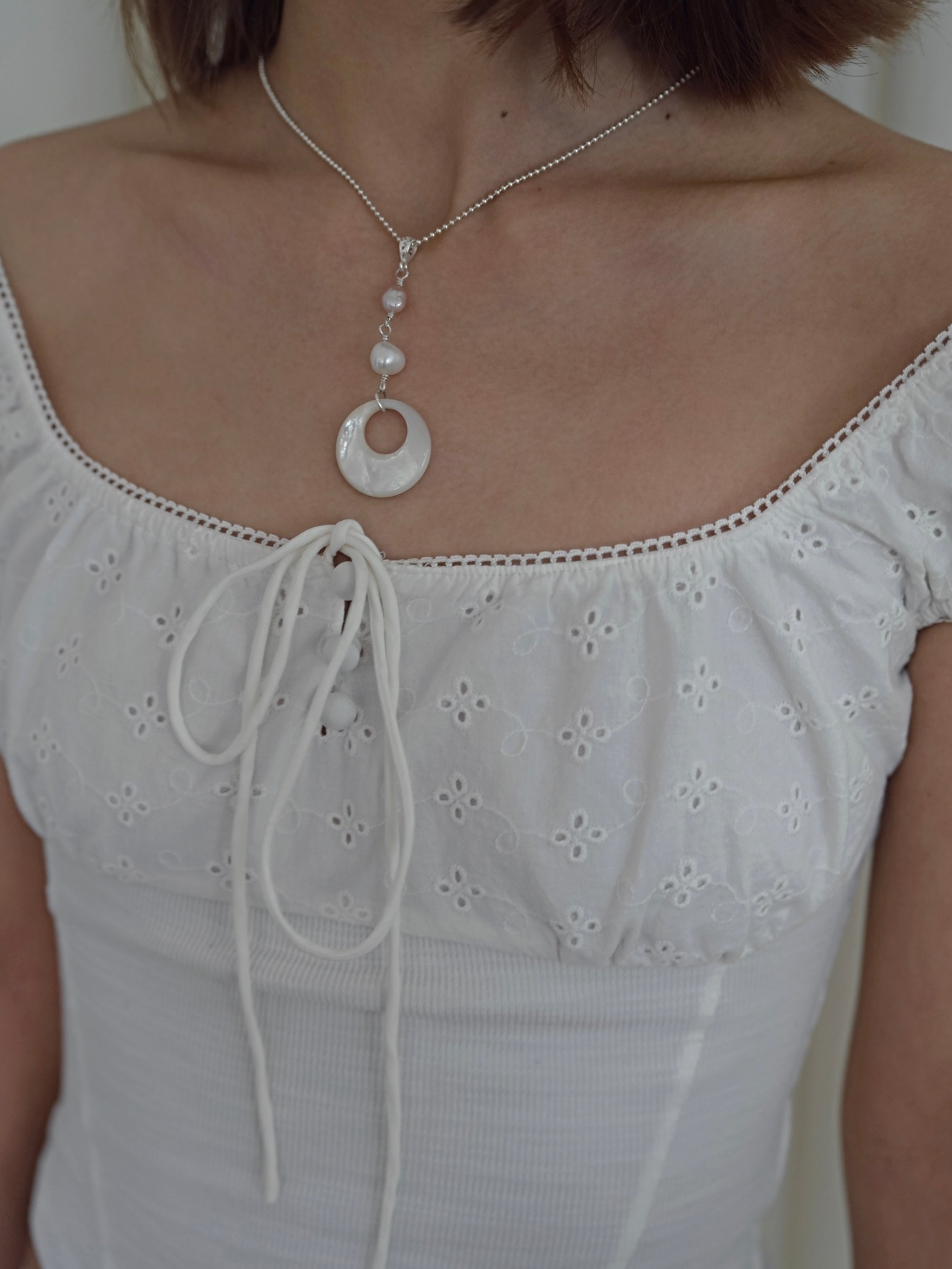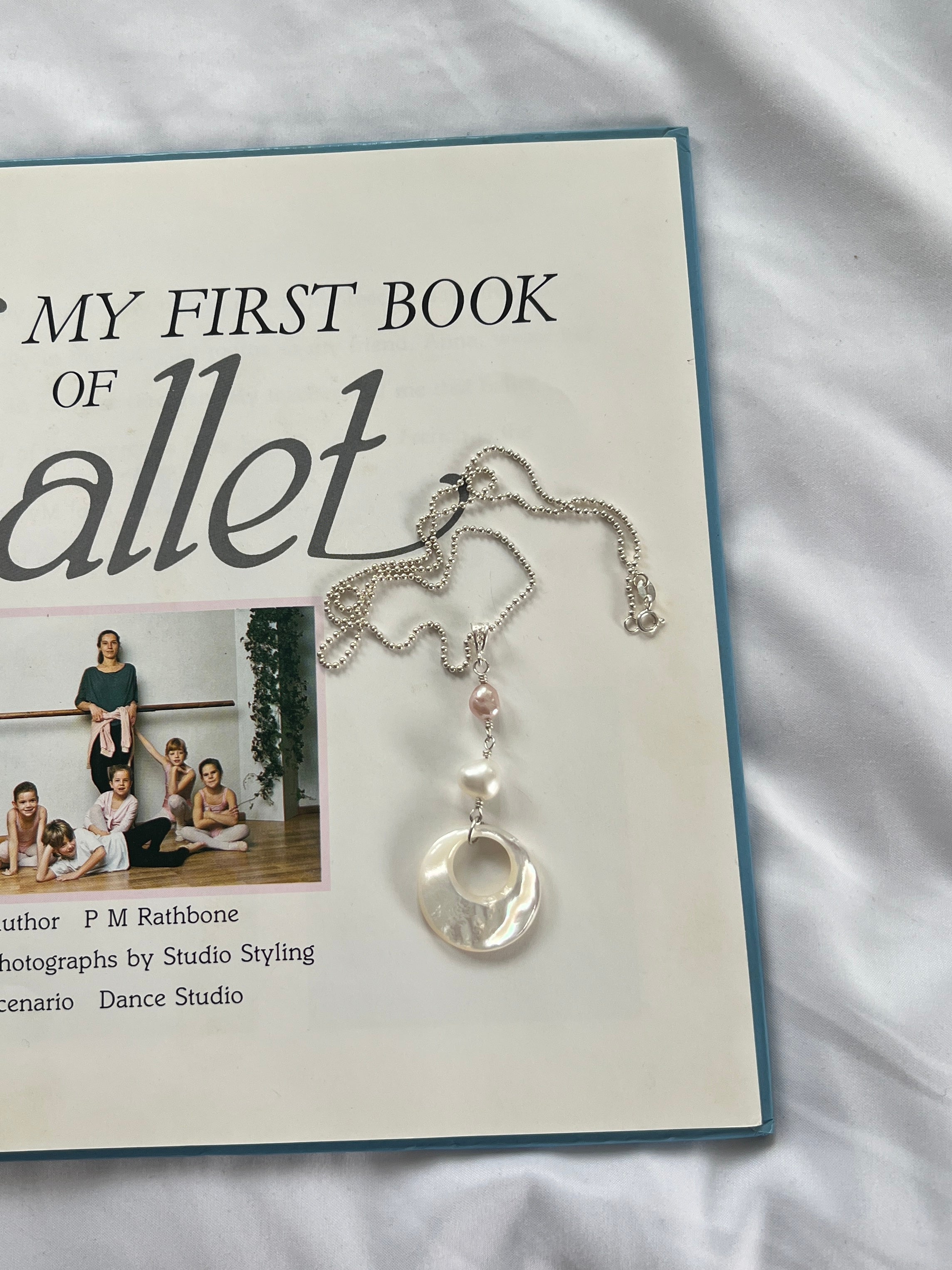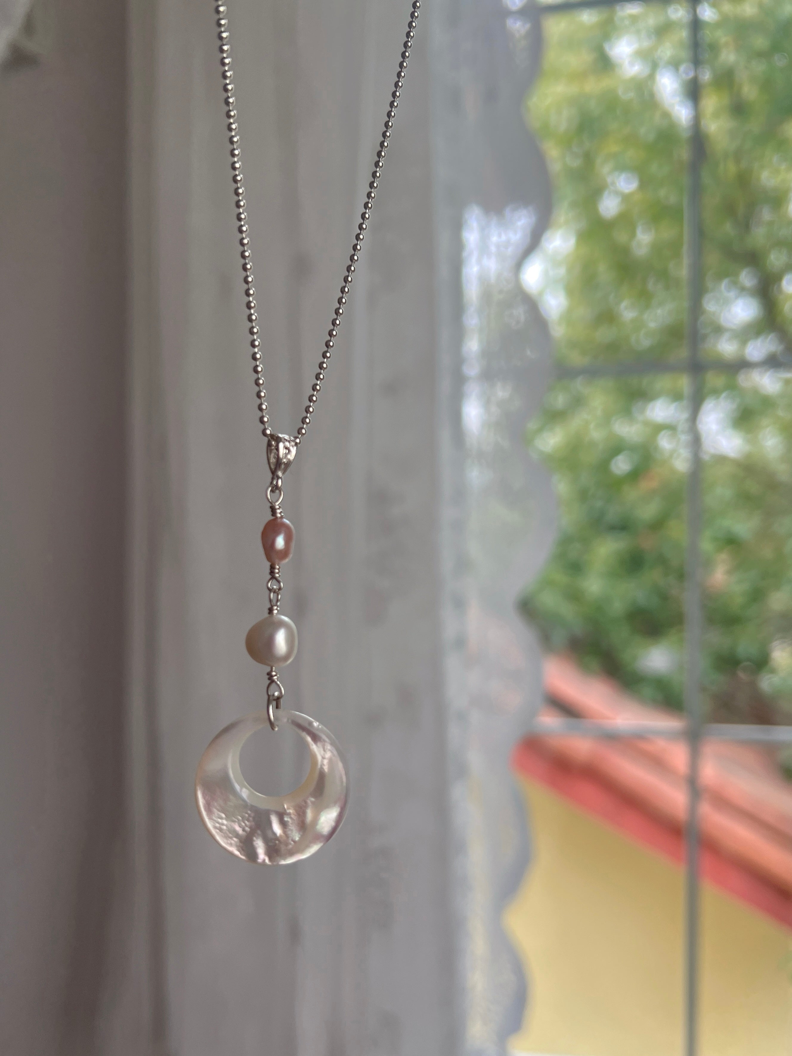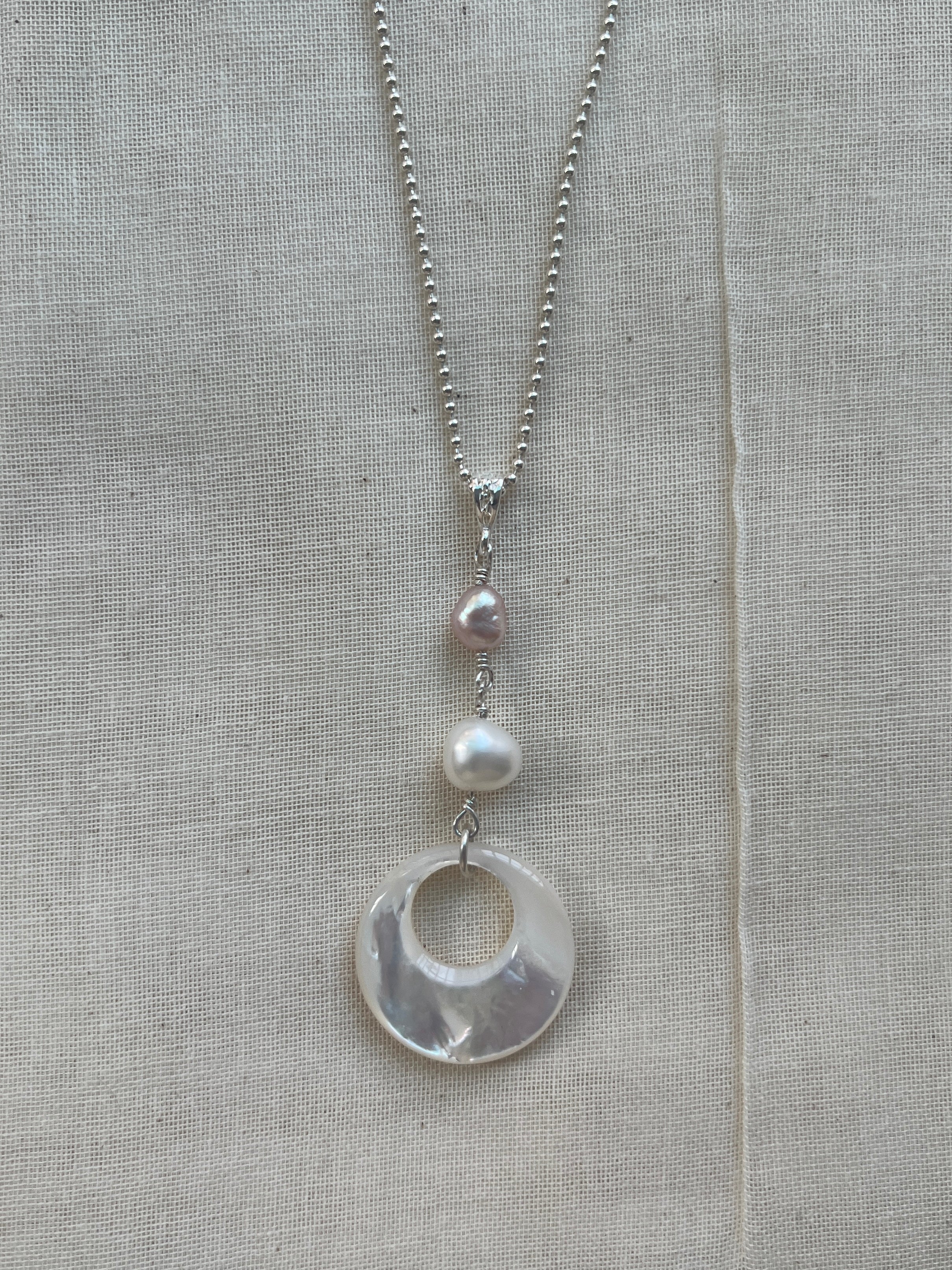 Freshwater pearls and a mother of pearl pendant are connected by hand with sterling silver, letting their natural tones and textures sit quietly together.