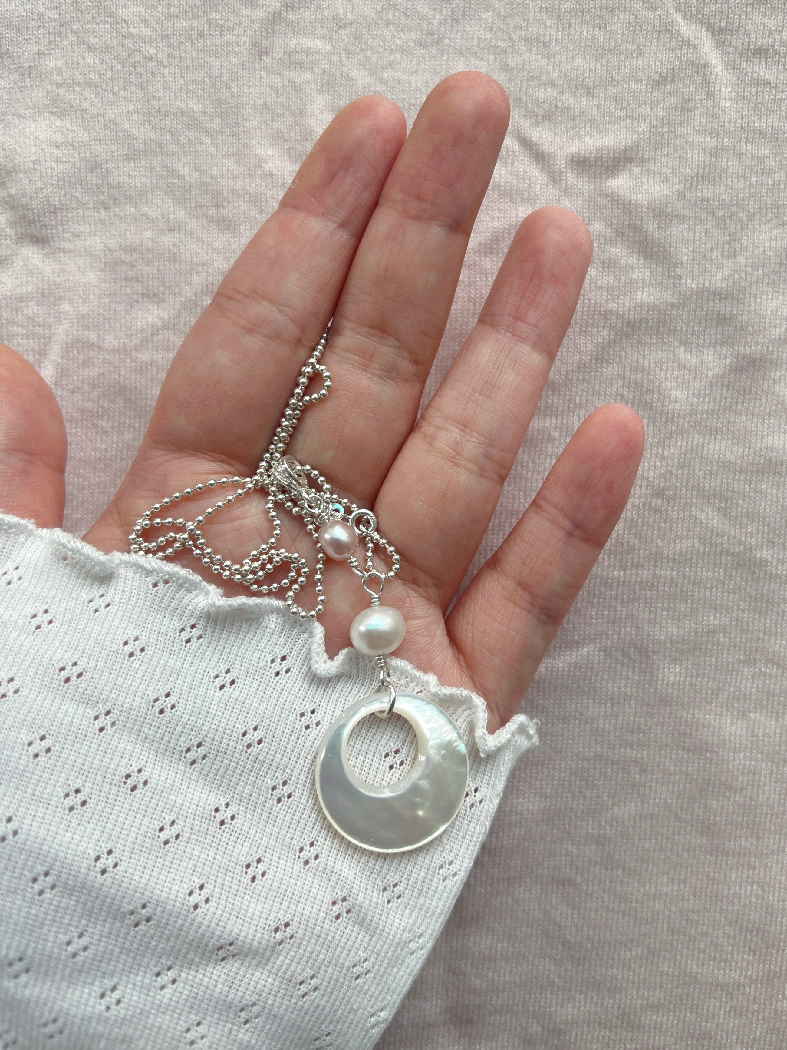 ♡ Freshwater pearls, mother of pearl charm, sterling silver chain and findings