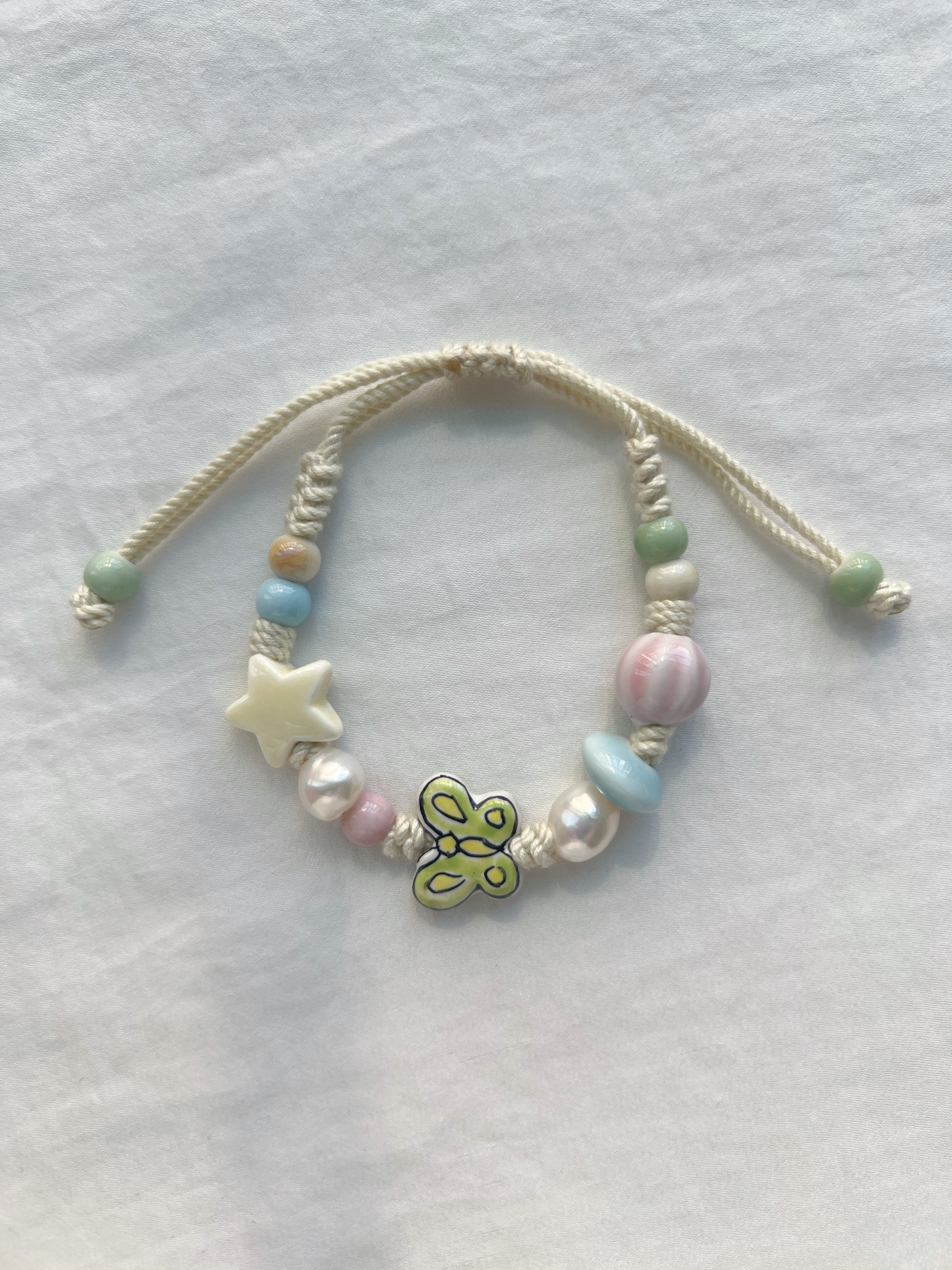 Soft vibes with natural freshwater pearls and a ceramic green butterfly designed to fit any wrist and carry a gentle, fairy-like magic with you.