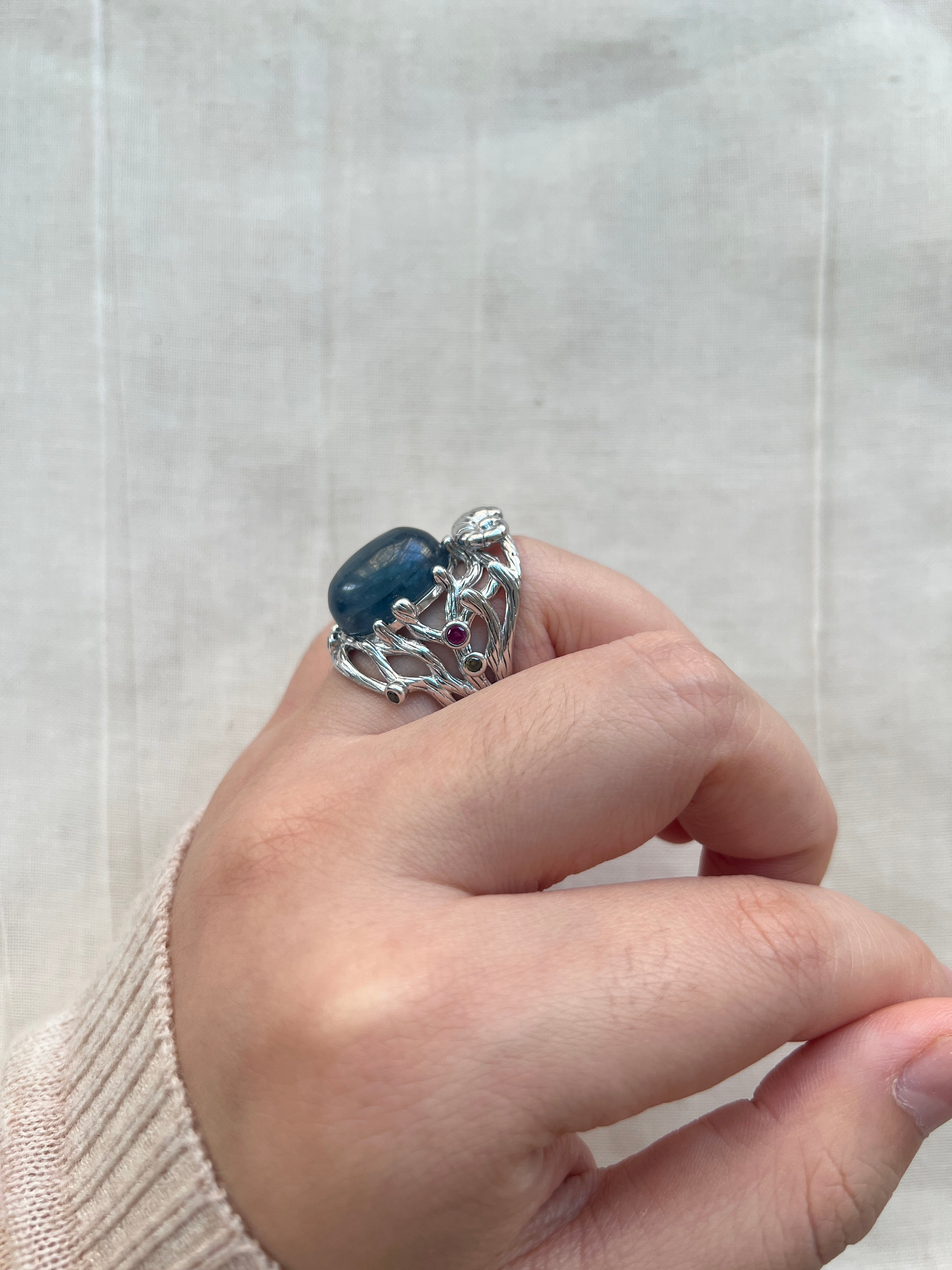 An ocean-inspired ring centered with an oversized blue gemstone.
