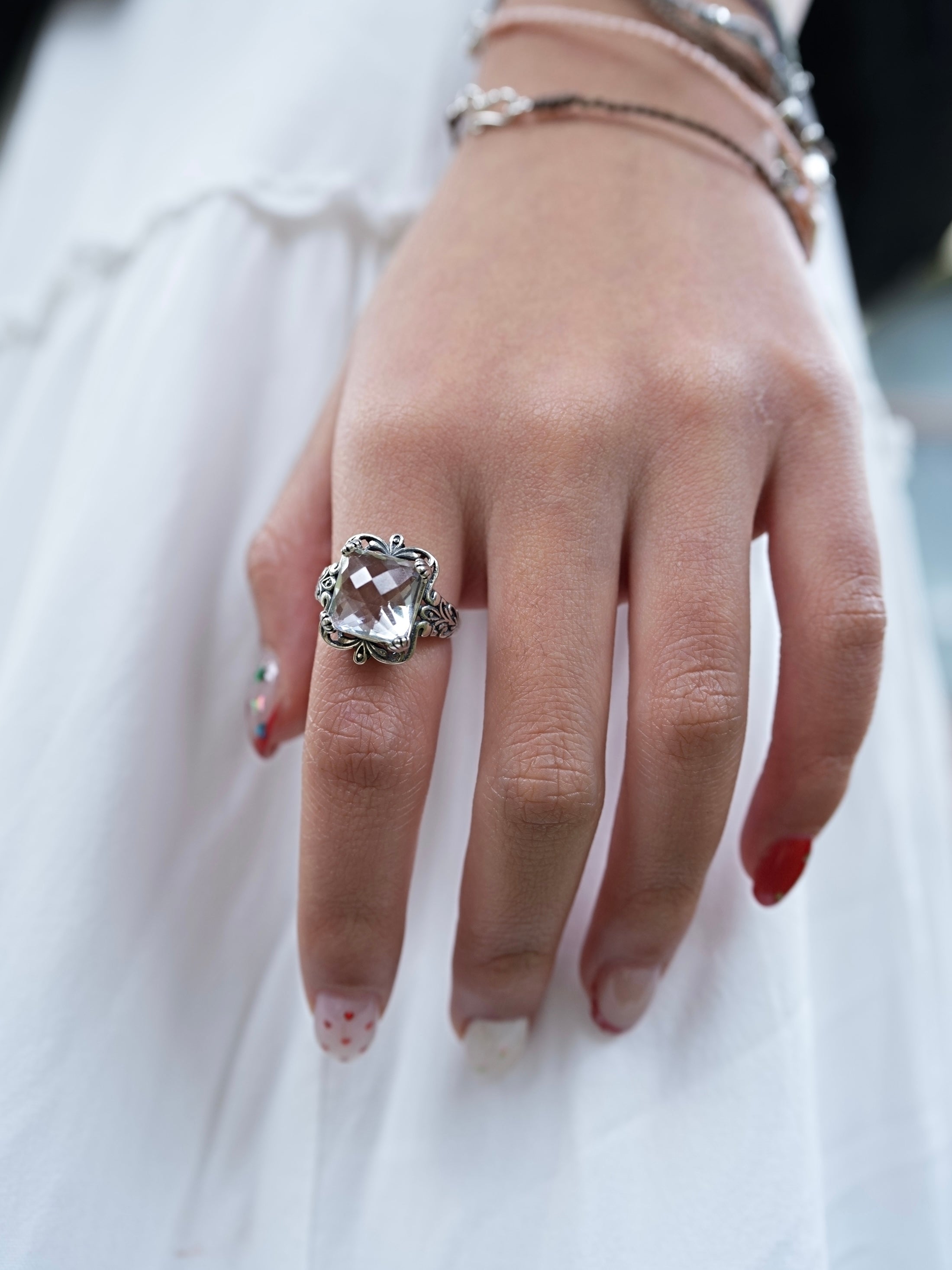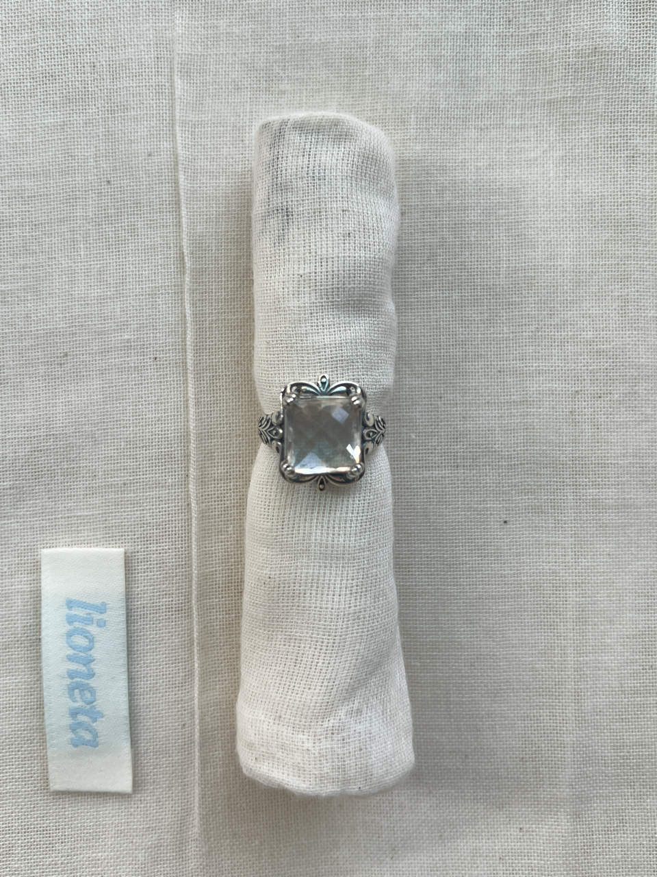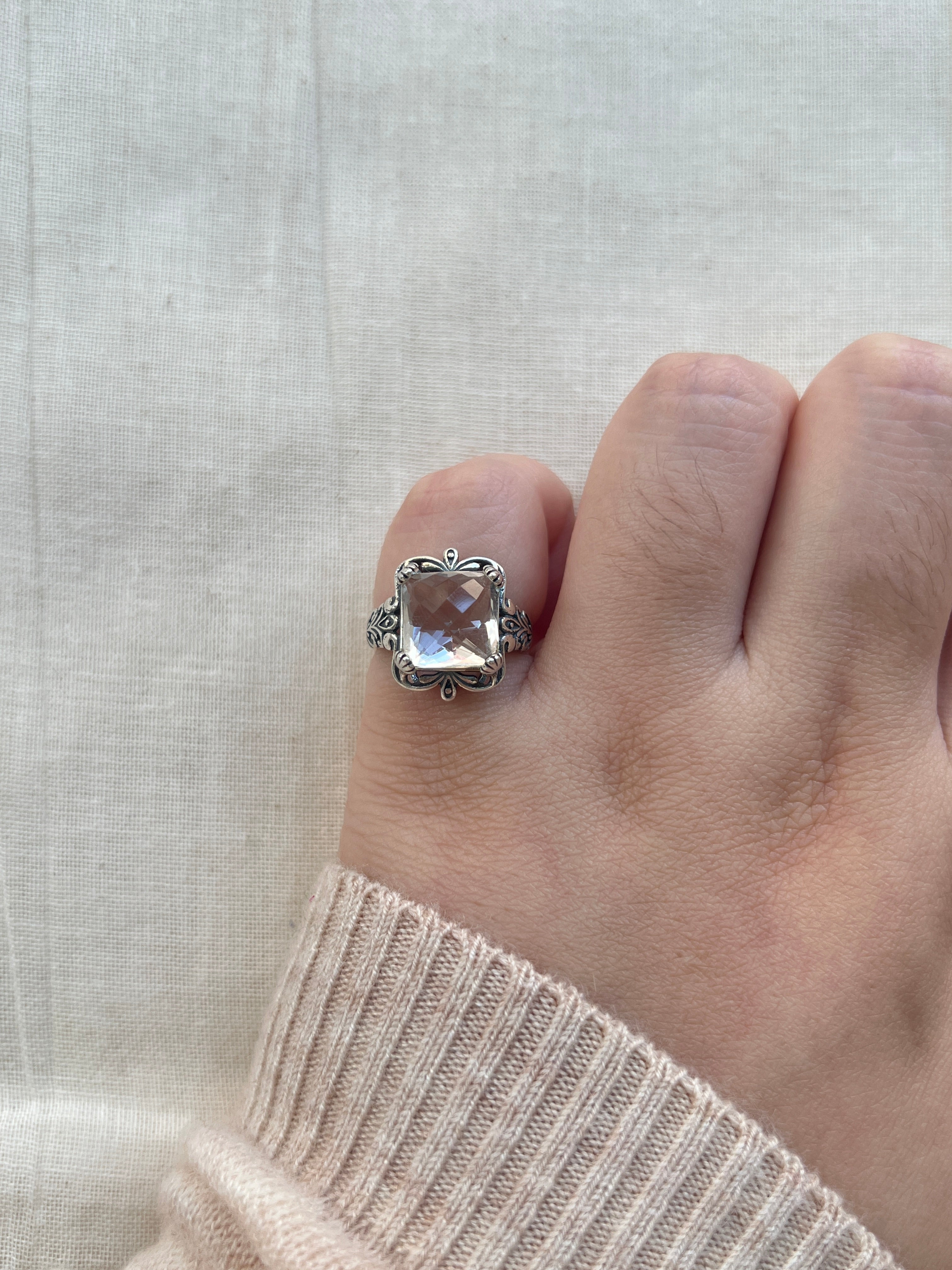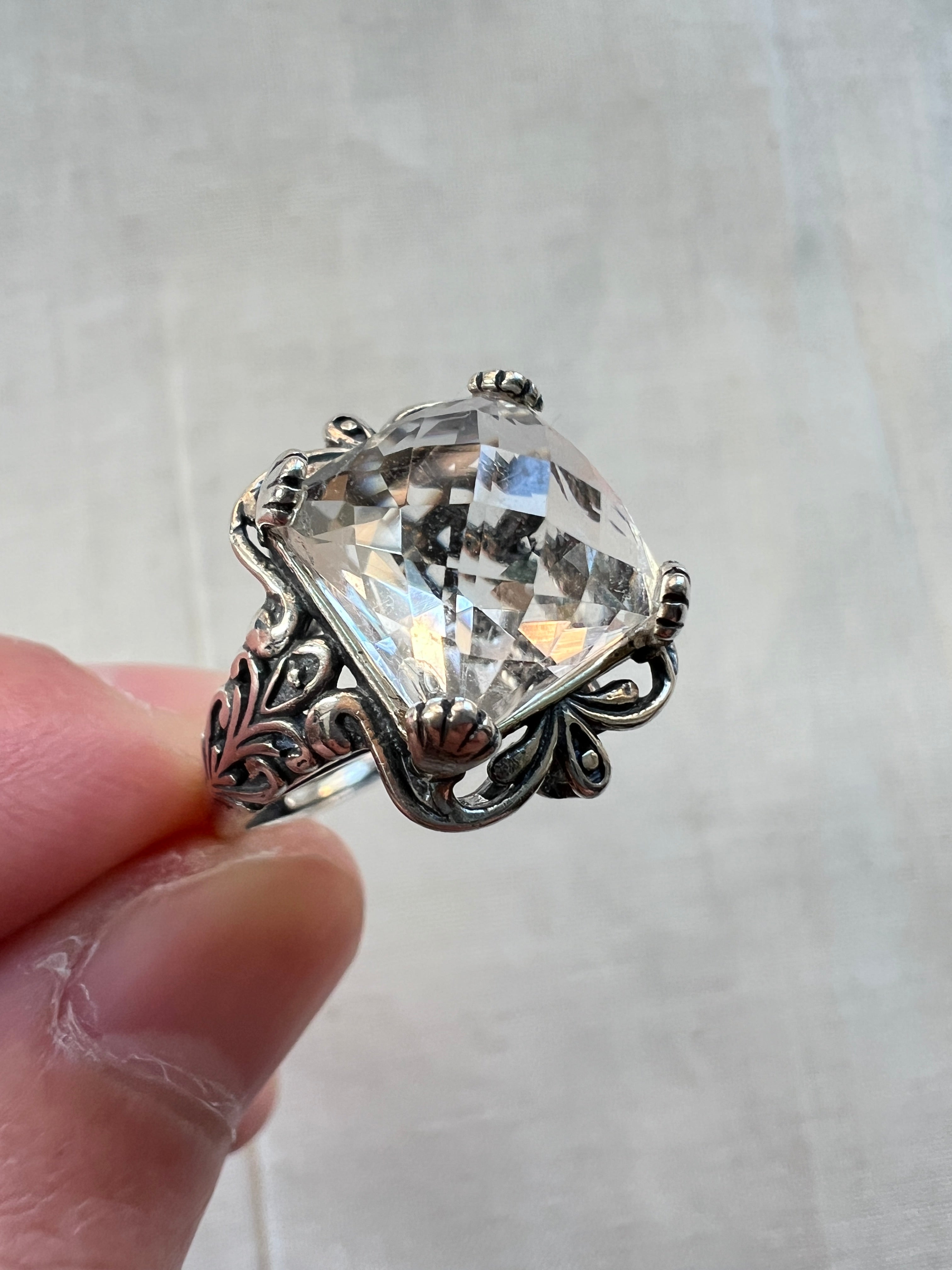 An uncommon square-cut clear quartz set in a vintage-style sterling silver setting.