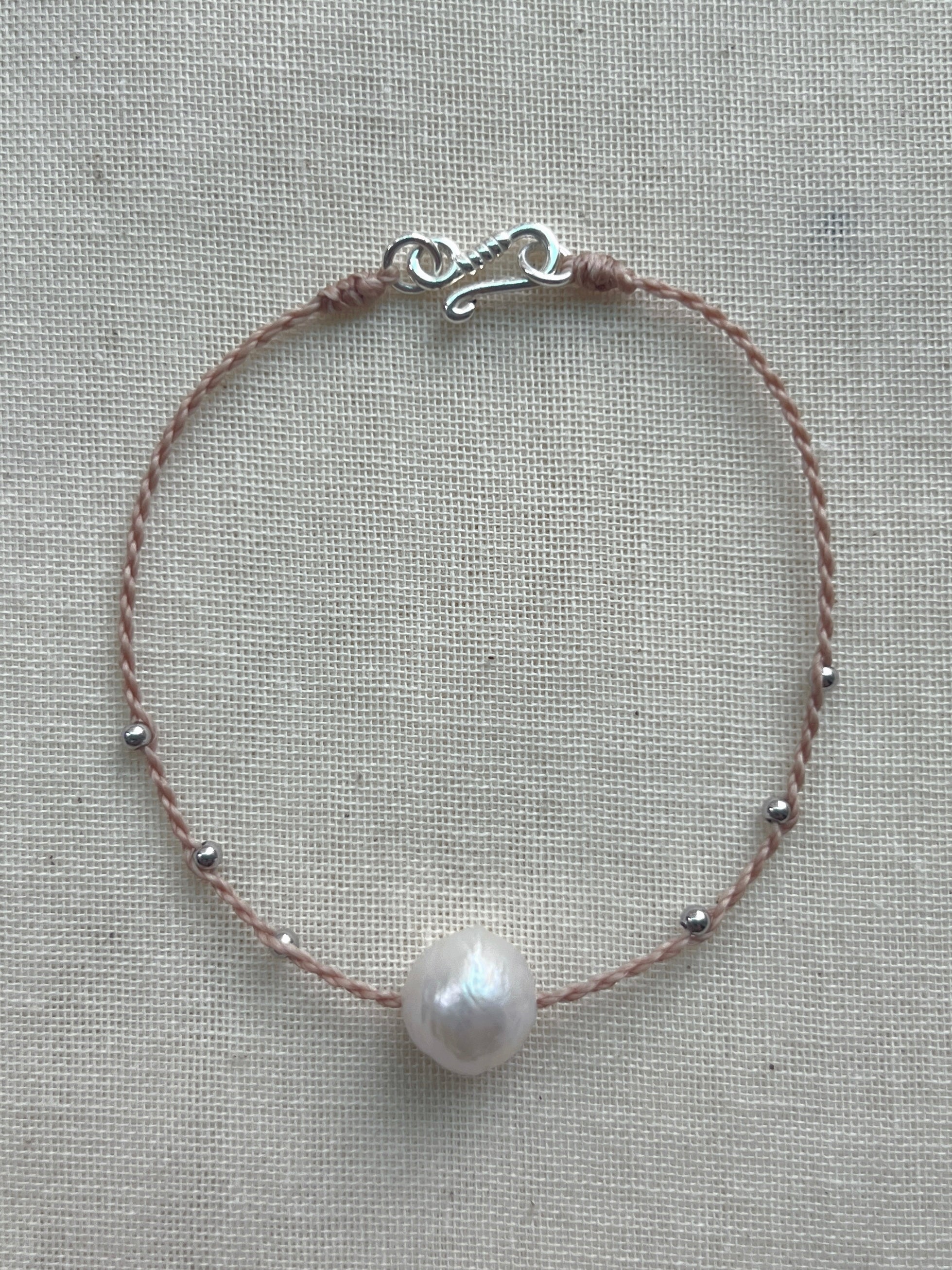A softly baroque round pearl braided with tiny sterling silver beads, finished with a sterling silver clasp.