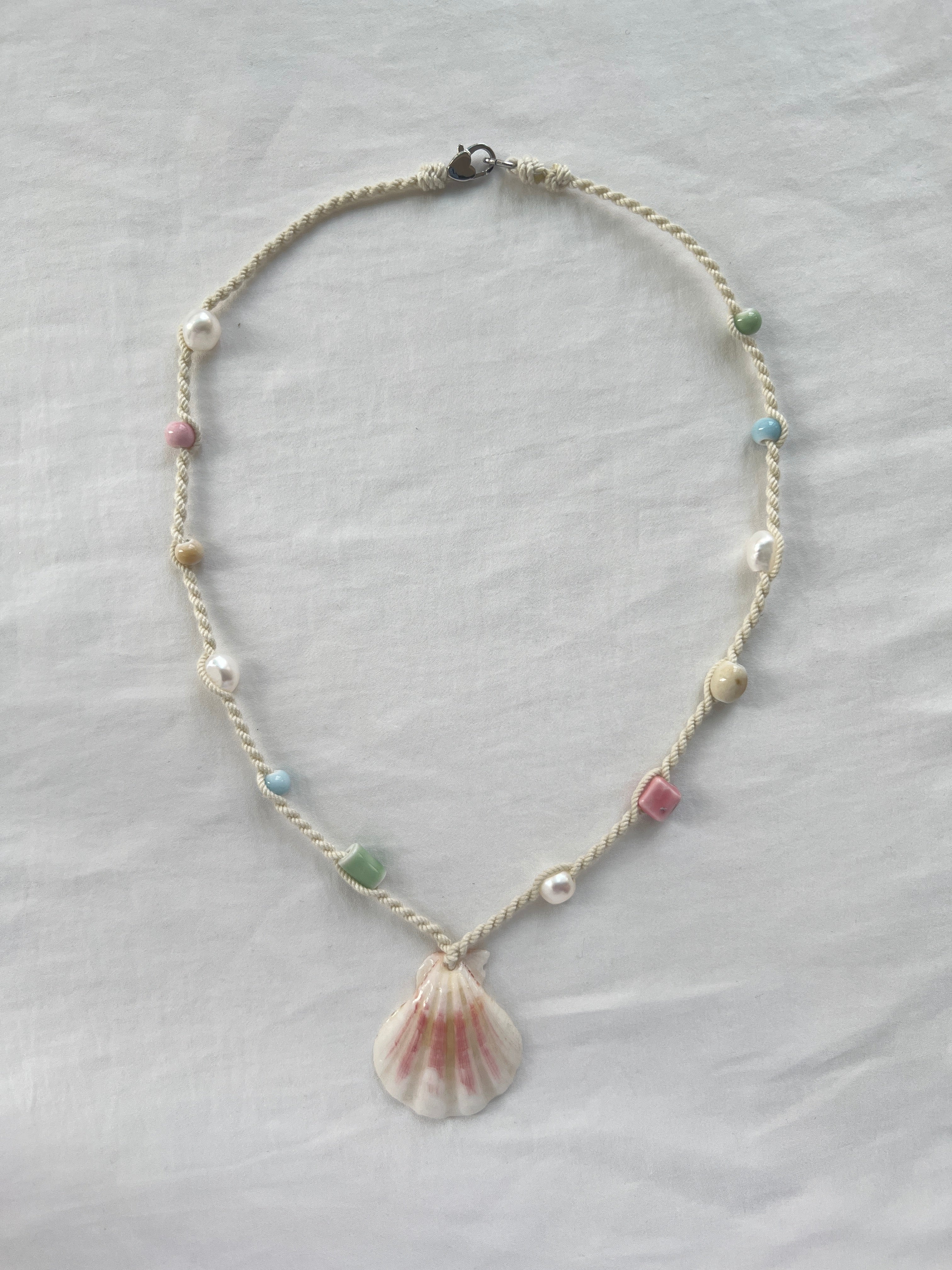 Materials: natural seashell, freshwater pearl, ceramic beads, cotton cord, stainless steel clasp