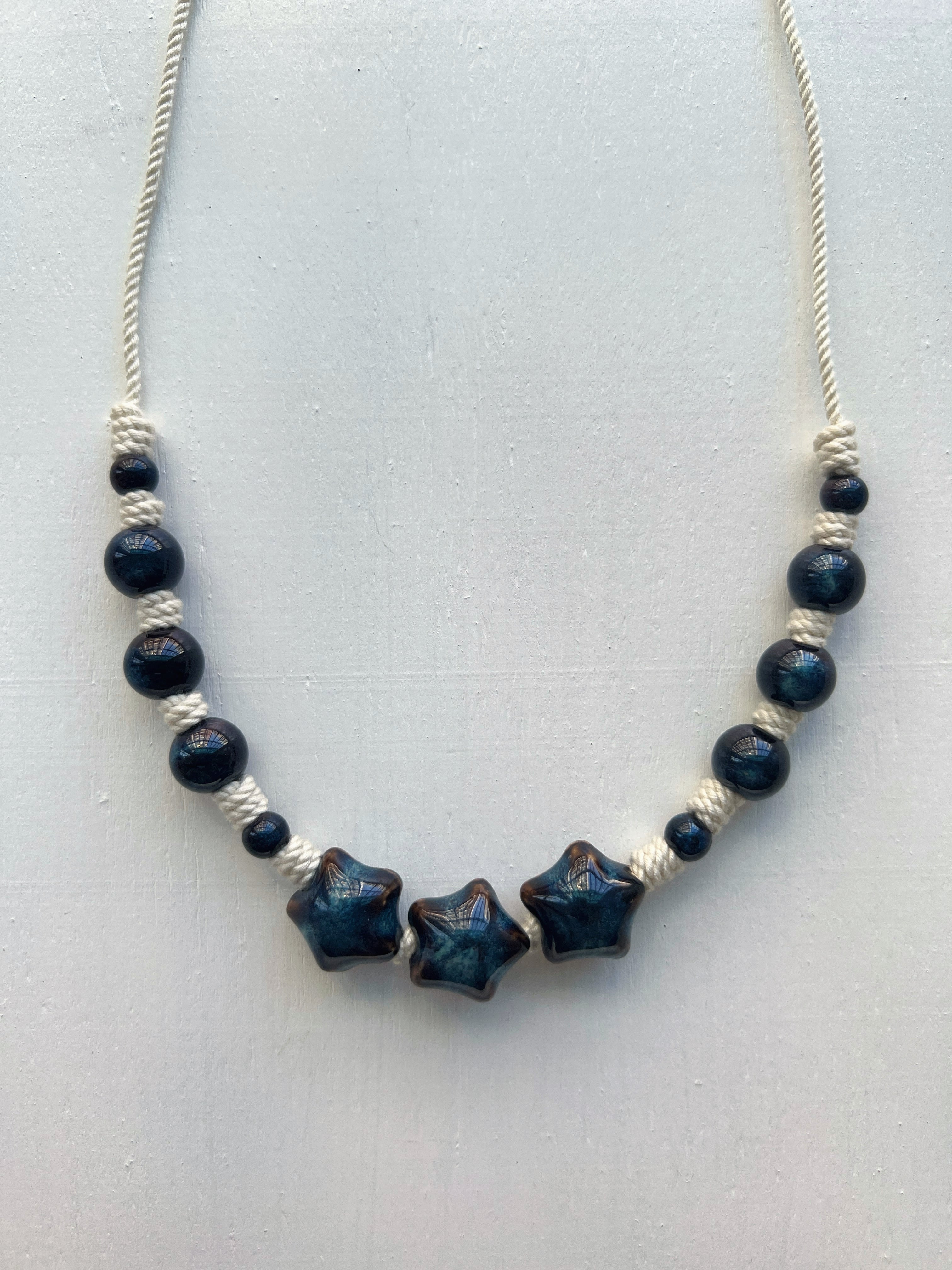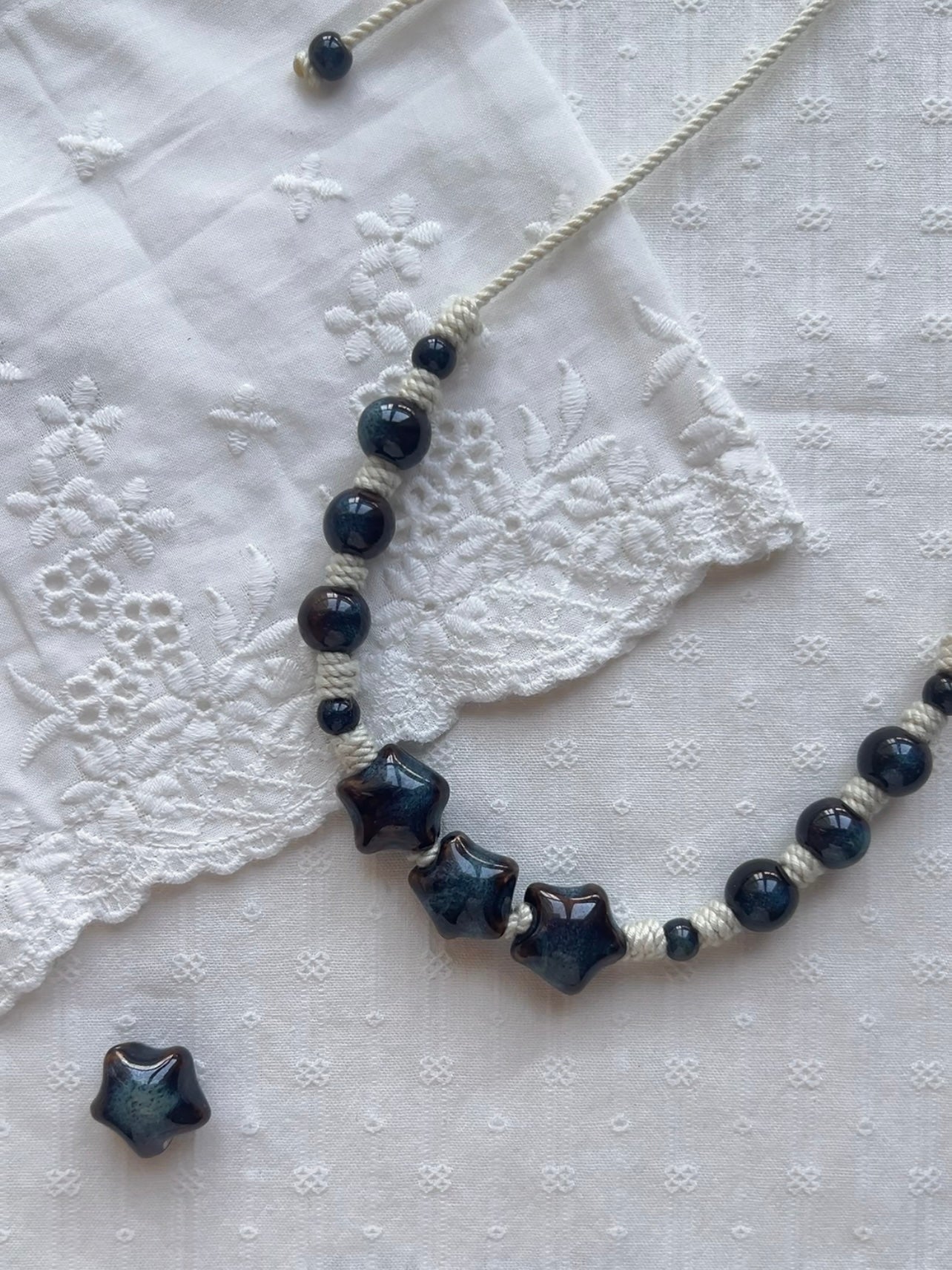 This choker is made with ceramic beads and soft cotton cord. The ceramic star beads appear blue in sunlight and dark in dim lighting. Each bead's color distribution is unique.